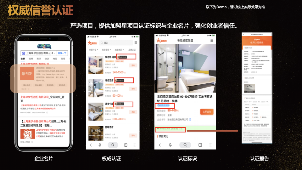 2、權威信譽認證:加盟星對合規項目授予黑金認證標識、出具權威認證報告,以及額外提供百度搜索企業名片,突顯精選品牌價值,提升用戶認知;