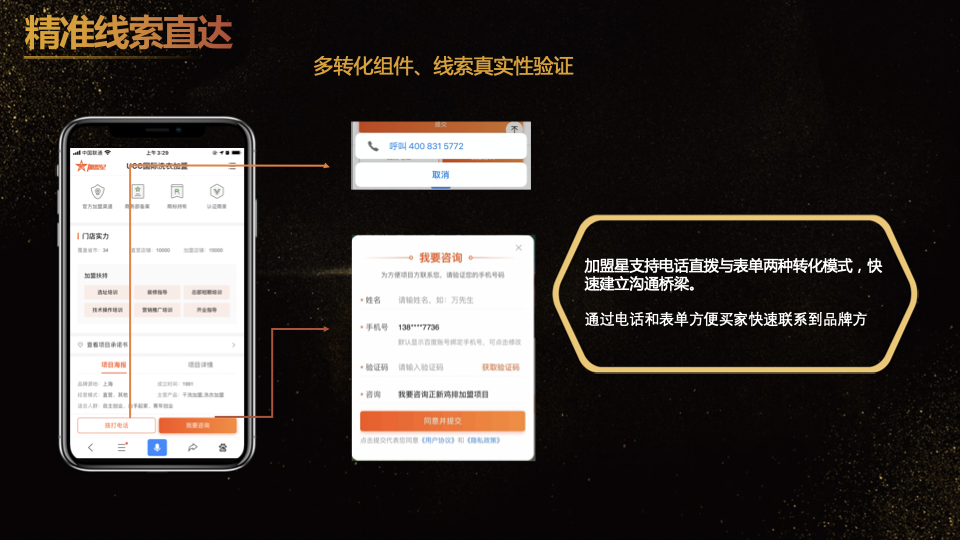 4、精準線索直達:基于百度AI能力,精準匹配用戶需求和加盟項目,對投資者線索做真實性驗證,確保項目方第一時間可獲得精準線索;