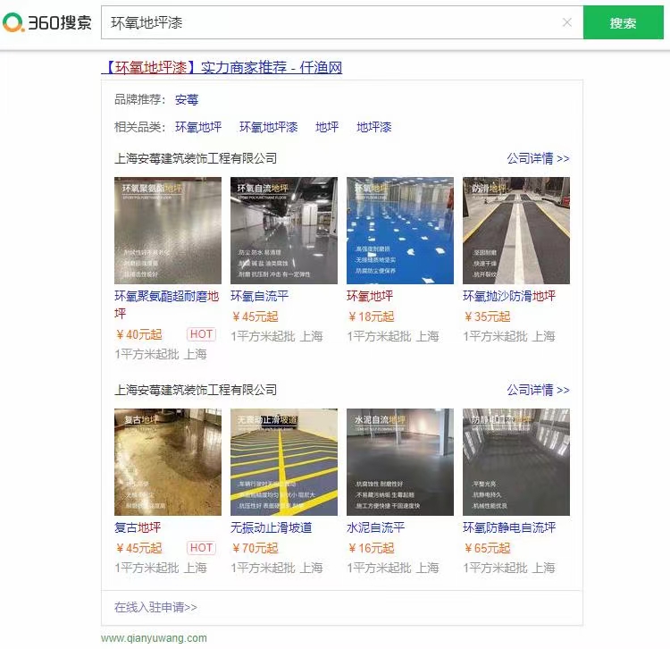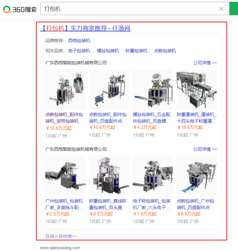 電腦端移動(dòng)端同步,一次合作,多終端陣地展現(xiàn),無論通過什么渠道,在360引擎搜索關(guān)鍵詞的時(shí)候(如360搜索“油性防火涂料”、“點(diǎn)焊機(jī)”、“防靜電abs”等),首頁展現(xiàn)如下圖的卡片形式,包含“品牌”、“相關(guān)品類”、“公司名”、“產(chǎn)品圖片”、“產(chǎn)品信息”、“價(jià)格”等,點(diǎn)開后為具體的詳情介紹。