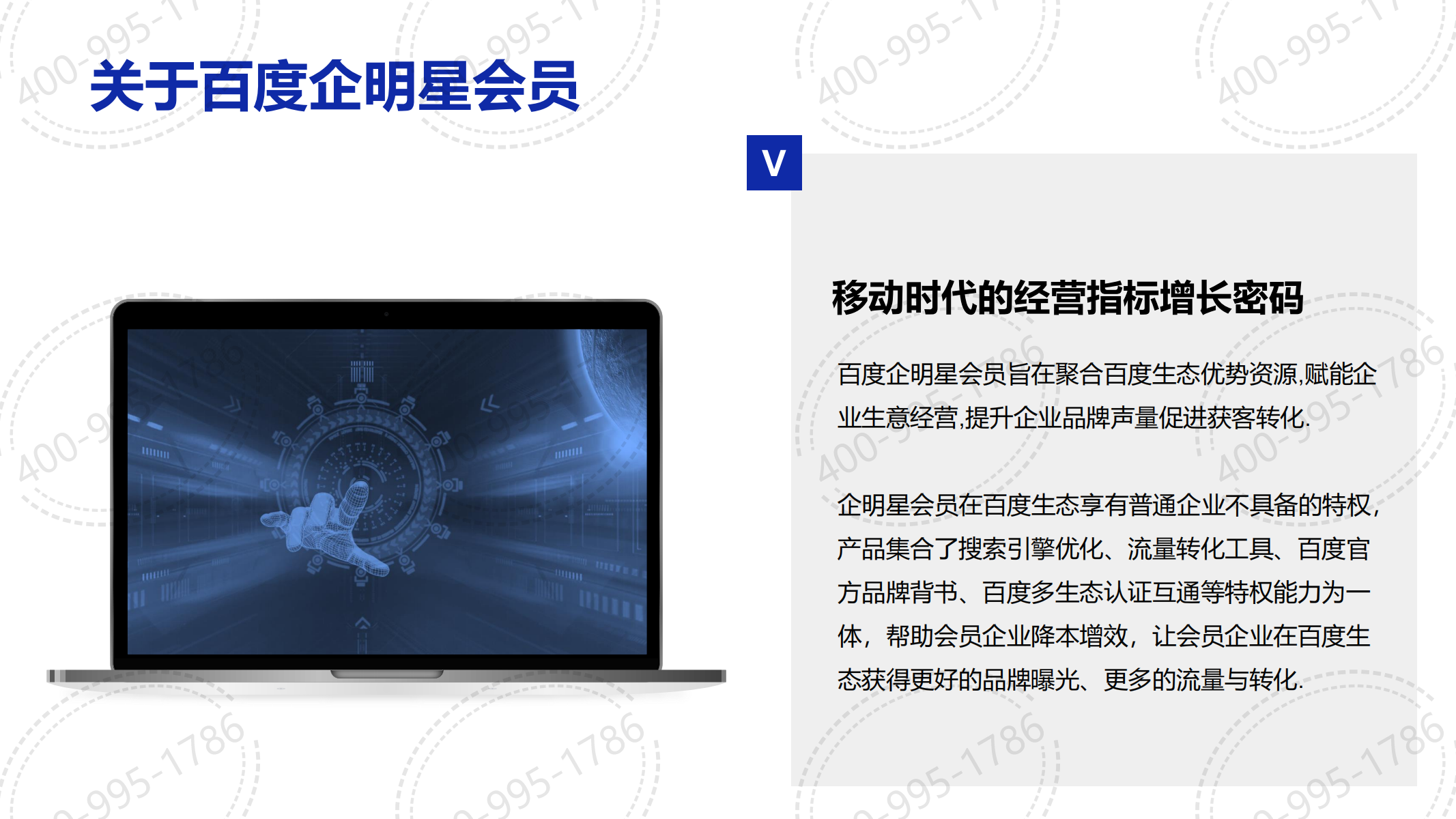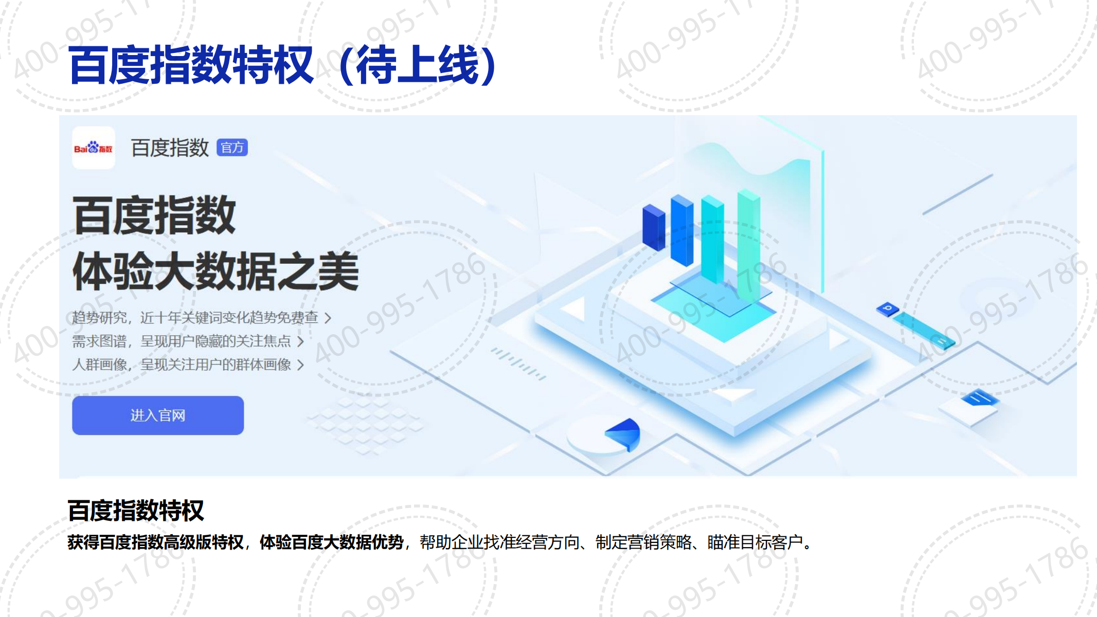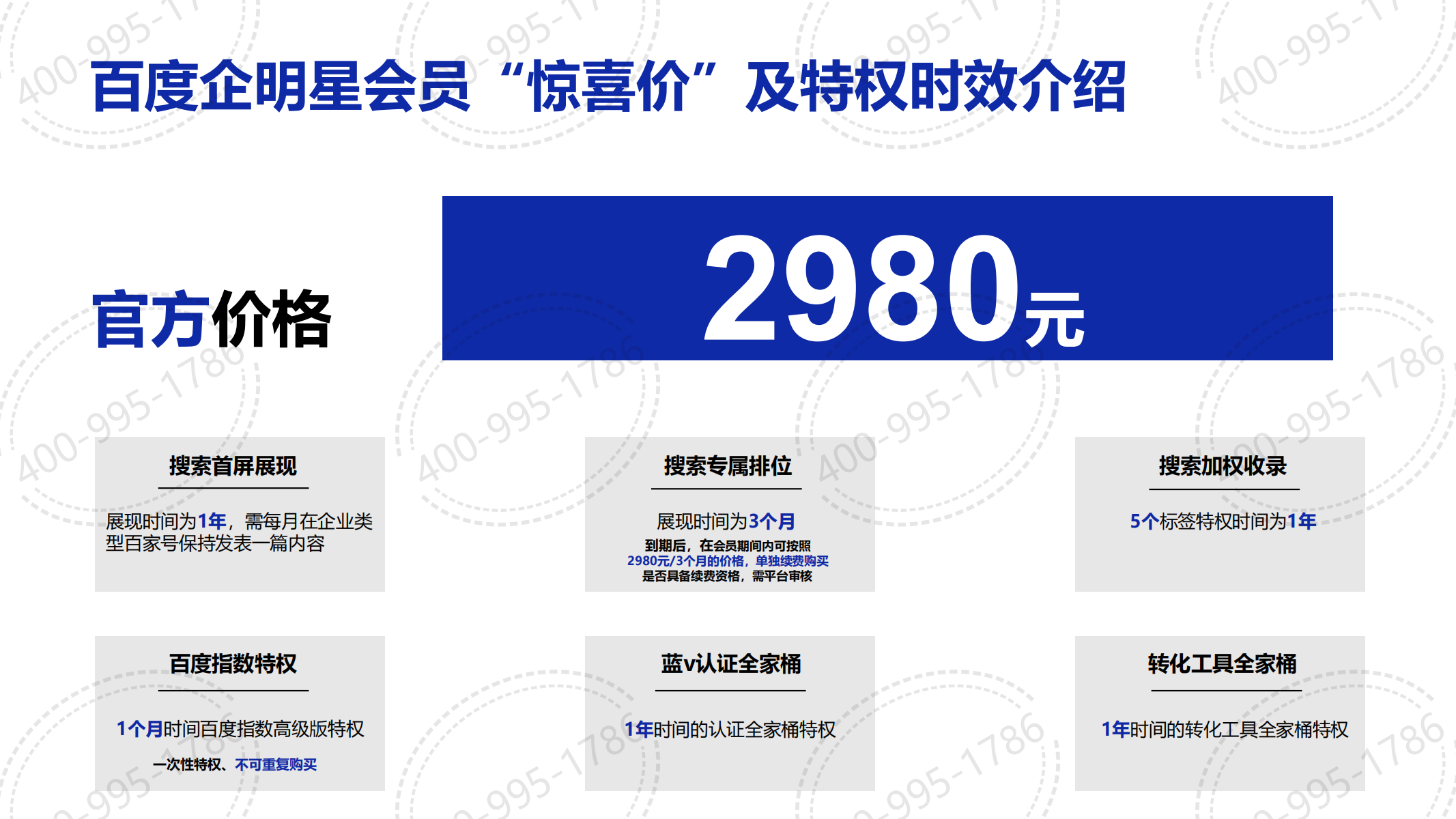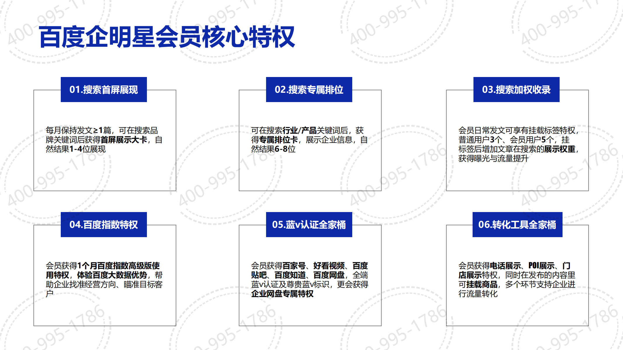 百度企明星會(huì)員旨在聚合百度生態(tài)優(yōu)勢(shì)資源,賦能企業(yè)生意經(jīng)營,提升企業(yè)品牌聲量促進(jìn)獲客轉(zhuǎn)化.,搜索首屏展現(xiàn),搜索專屬排位,搜索加權(quán)收錄,百度指數(shù)特權(quán),藍(lán)V認(rèn)證全家桶,轉(zhuǎn)化工具全家桶