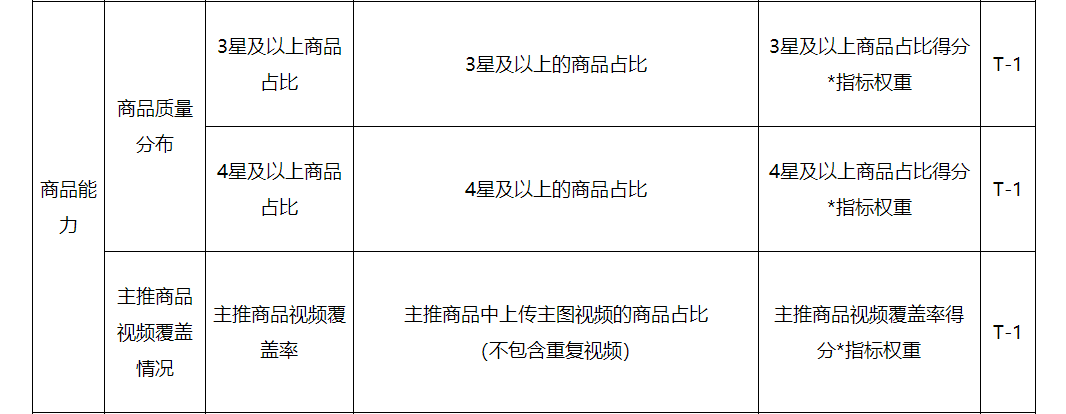 商品能力分=3星及以上商品占比得分*指標(biāo)權(quán)重+4星及以上商品占比得分*指標(biāo)權(quán)重+主推商品視頻覆蓋率得分*指標(biāo)權(quán)重