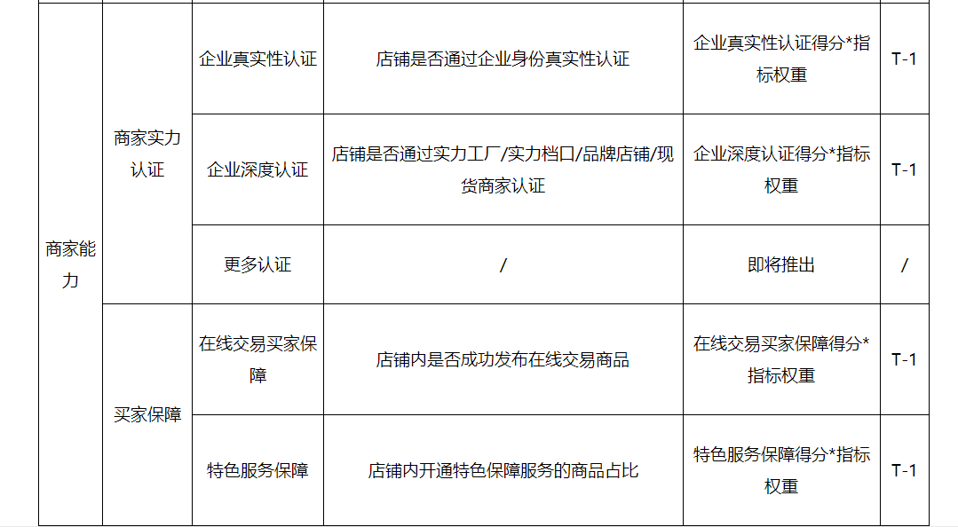 商家能力分=企業(yè)真實(shí)性認(rèn)證得分*指標(biāo)權(quán)重+企業(yè)深度認(rèn)證得分*指標(biāo)權(quán)重+在線交易買家保障得分*指標(biāo)權(quán)重+特色服務(wù)保障得分*指標(biāo)權(quán)重